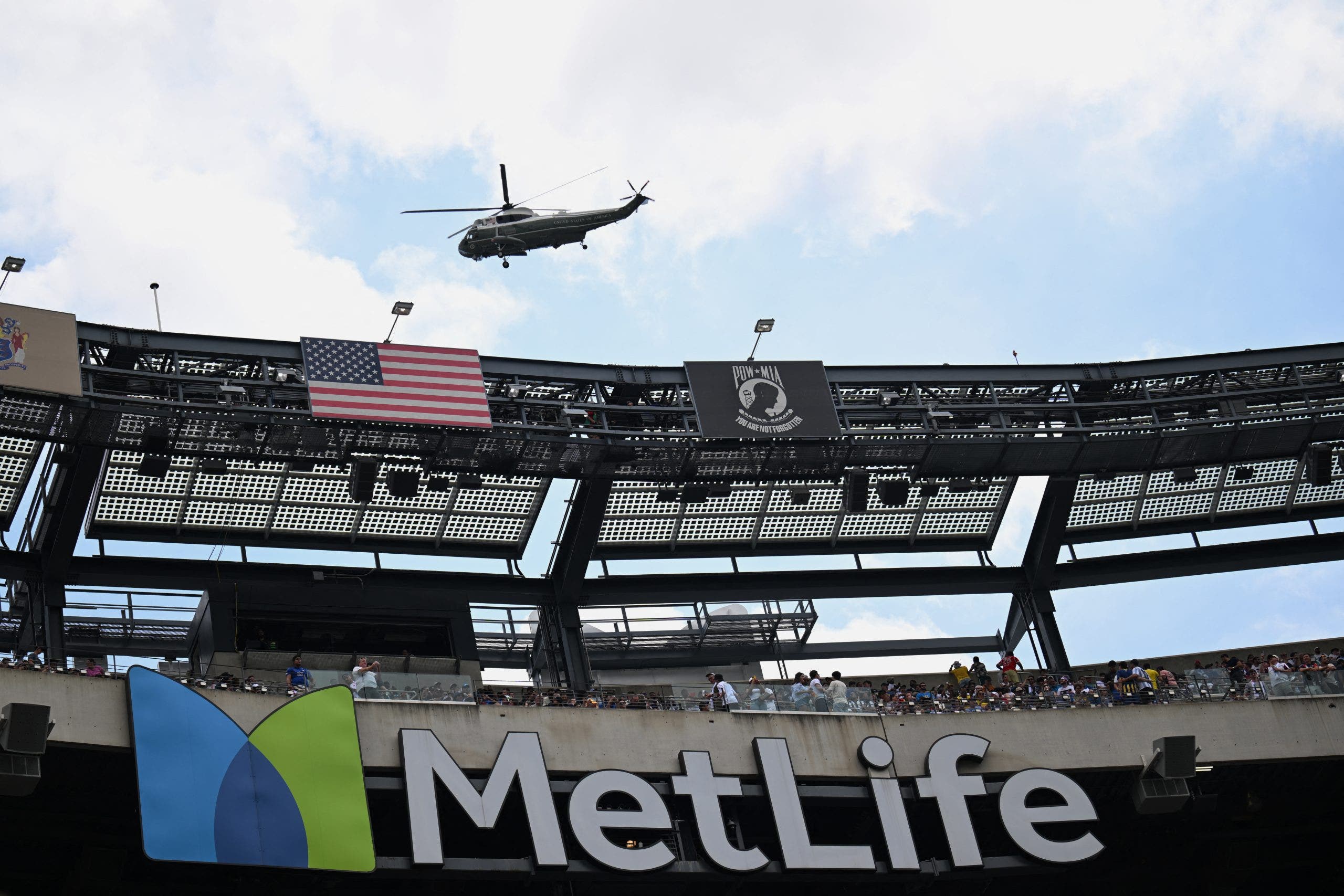 At MetLife Stadium, a few miles west of the Hudson River, three military helicopters roared overhead — one of them carrying Donald Trump, who became the first sitting American president ever to attend a major international soccer match.