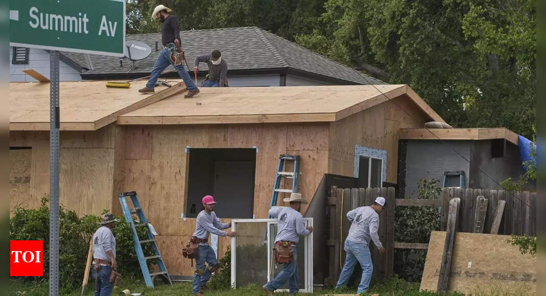 Construction crews build a new roof and windows on a fire damaged…