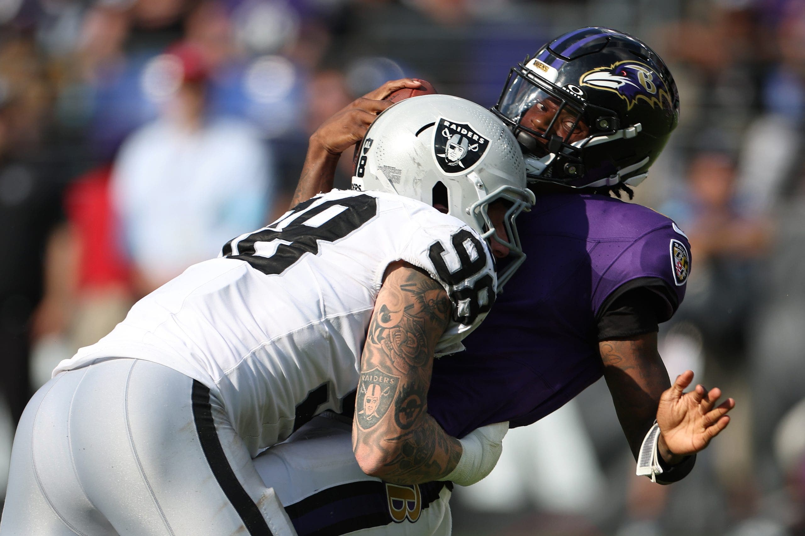 Maxx Crosby sacks QB Lamar Jackson during the Raiders’ Week 2 win over the Ravens. (Getty Images)